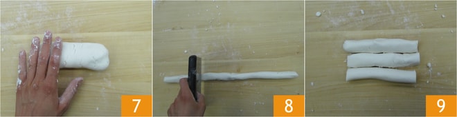 Reprenez la boule de pâte et étalez-la 7 pour former des boudins, coupez-les en morceaux plus petits 8 9.