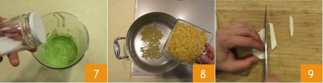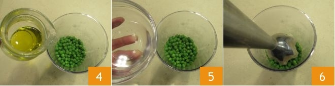 et mettez-les dans un verre haut, ajoutez l'huile d'olive 4 et l'eau de cuisson que vous avez mise de côté 5, mixez le tout avec un mixeur plongeant 6 pour obtenir une crème.