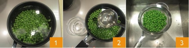 Pour préparer les momies de pâtes, commencez par faire cuire les pois pendant environ 4 minutes 1. Mettez sur le feu une casserole pleine d'eau à saler une fois à ébullition, elle servira pour la cuisson des pâtes. Avant que les pois ne soient cuits, prélevez une petite louche d'eau de cuisson des pois (environ 40 g) et mettez-la de côté dans un petit bol 2. Une fois le temps de cuisson des pois écoulé, égouttez-les 3