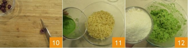 Coupez les olives en deux pour obtenir les petits yeux 10. Égouttez les mini farfalle, mettez-les dans un bol et assaisonnez-les avec le pesto de pois 11, assaisonnez avec le Parmesan râpé 12.
