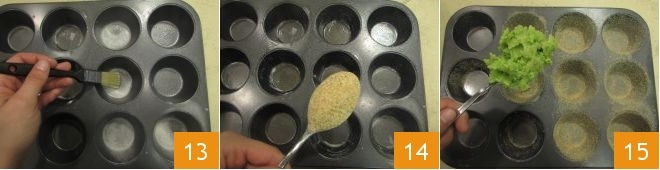 Badigeonnez d'huile un moule à muffins 13, tapissez les fonds et les bords de 8 moules avec de la chapelure 14 et remplissez-les avec une cuillère et demie de pâtes 15.