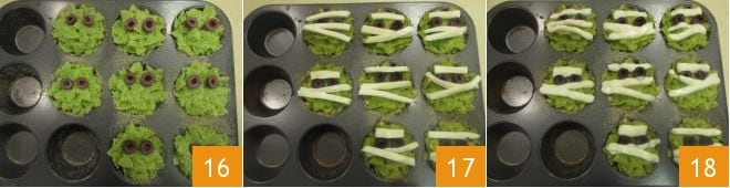 Placez les rondelles d'olives sur les paniers de pâtes pour simuler les petits yeux 16. Faites cuire dans un four préchauffé à 200°, pendant 10 minutes. Après les 10 minutes, ajoutez les bandes de fromage non parfaitement alignées pour créer les bandages 17 et remettez au four pour seulement 2 minutes, le temps que le fromage fonde. Une fois cuites, sortez vos momies de pâtes du four et servez-les bien chaudes 18.