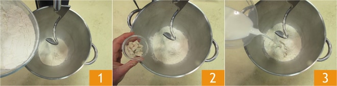 Pour préparer les montanarine à la burrata et au saumon fumé, versez dans le batteur la farine T45 1, la levure émiettée 2 et le lait 3. Travaillez avec le crochet pendant 5 minutes jusqu'à ce que la pâte soit accrochée au crochet.