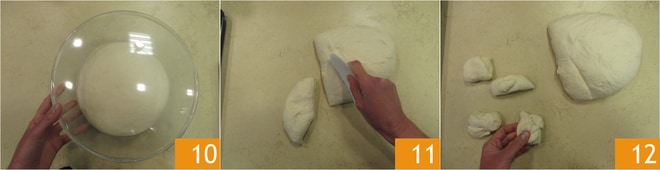 Après le temps de repos 10, transférez la pâte levée sur le plan de travail et divisez-la en 20 pièces d'environ 45 g 12 13.