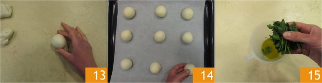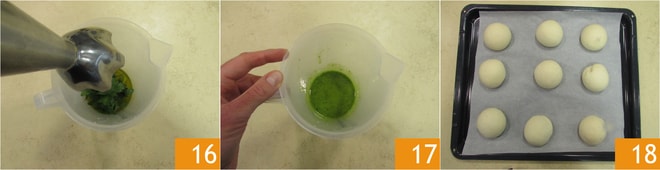 Formez des boules avec la pâte 13 et placez-les sur une ou plusieurs plaques recouvertes de papier sulfurisé (en les espaçant d'au moins 5 cm les unes des autres) 14. Laissez lever les montanarine encore 30 minutes dans un endroit à l'abri des courants d'air et à environ 25° (couvrez éventuellement avec un film plastique en contact). Pendant ce temps, dans un récipient haut, versez de l'huile et du persil 15.