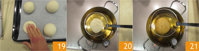Applatissez légèrement les boules au centre 19. Chauffez l'huile de friture jusqu'à 165°, puis plongez les montanarine 20 et cuisez pendant environ 3 à 5 minutes chacune jusqu'à dorure 21.
