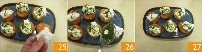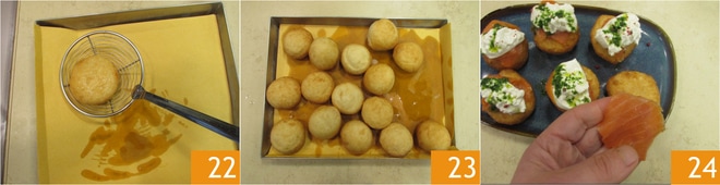 Égouttez les montanarine sur du papier absorbant pour fritures 22, laissez tiédir 23 et garnissez avec le saumon fumé 24.