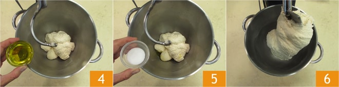 Ajoutez à la pâte l'huile 4 et le sel 5 et retravaillez pendant environ 5 à 10 minutes jusqu'à obtenir une pâte lisse, souple et élastique 6.
