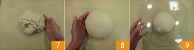 Transférez la pâte sur le plan de travail 7, formez une boule en roulant la pâte avec la paume des mains 8, puis placez la pâte dans un grand bol. Couvrez avec un film plastique 9 et laissez lever à environ 25° pendant 2 heures, jusqu'à ce que le volume double.