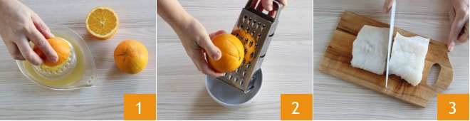 Pour réaliser la morue à l’orange, commencez par presser le jus d'orange 1 et râper le zeste 2. Prenez la morue dessalée et coupez-la en quatre morceaux 3.