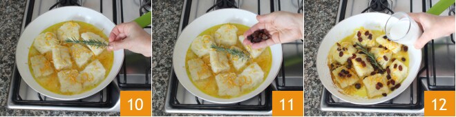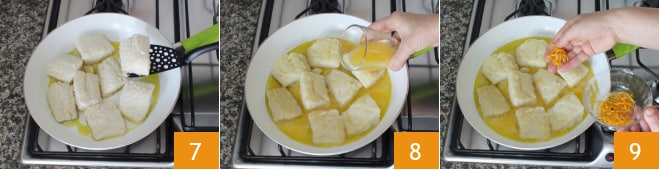Disposez les morceaux de morue 7 et faites-les dorer pendant 3 minutes à feu moyen, puis retournez-les et cuisez-les pendant encore 3 minutes. Déglacez avec le jus d'orange 8 et aromatisez avec le zeste que vous avez râpé 9.
