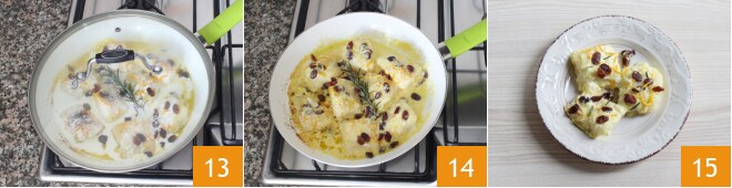 Assaisonnez avec une branche de romarin 10, salez et ajoutez les raisins secs 11. Continuez la cuisson pour réduire la sauce à feu moyen pendant environ 3 minutes, puis versez la crème 12.