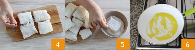Enlevez les éventuelles arêtes avec une pince de cuisine 4. Ensuite, farinez la morue sur tous les côtés 5. Dans une poêle, chauffez l'huile avec une gousse d'ail 6.
