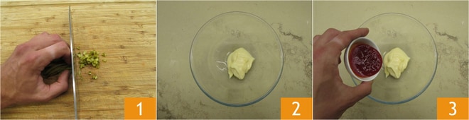 Pour réaliser la morue en beignet, commencez par placer la farine et le bol au congélateur pendant 15 minutes, il est important qu'ils soient bien froids. Préparez la sauce: hachez les cornichons 1, puis versez dans un bol la mayonnaise 2 et le ketchup 3
