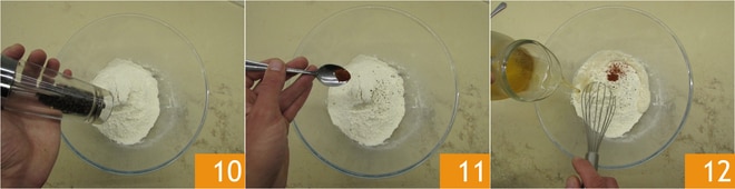 Dans un bol, mettez la farine, le sel, le poivre 10 et le paprika 11. Pendant que vous mélangez avec un fouet, ajoutez également la bière glacée en filet 12.