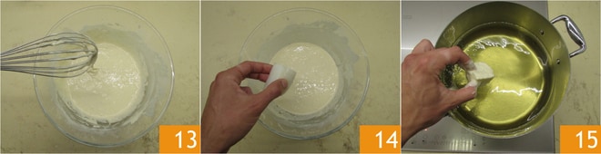 Vous devez obtenir un mélange lisse et sans grumeaux 13. Chauffez l'huile pour frire dans une casserole à bords hauts jusqu'à ce qu'elle atteigne 180 degrés. Trempez les morceaux de morue dans la pâte 14, puis plongez-les dans l'huile quelques-uns à la fois 15, maximum 3.
