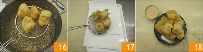 Faites frire pendant 5-8 minutes ou jusqu'à ce qu'ils soient bien dorés 16, puis égouttez sur un plateau recouvert de papier absorbant 17 et salez à votre goût. Servez immédiatement la morue en beignet avec la sauce 18.