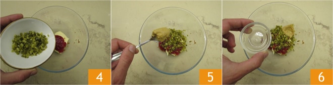 Ajoutez ensuite les cornichons hachés 4, la moutarde 5 et 2 cuillères à café du liquide de conservation des cornichons 6