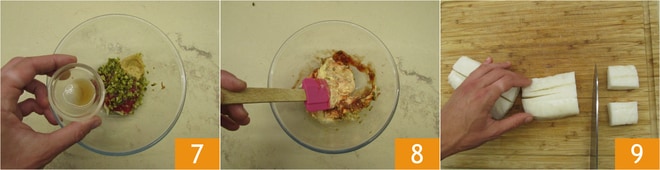 Complétez avec une pointe de tabasco 7 et mélangez pour incorporer, réservez la sauce. Coupez la morue déjà dessalée et sans peau en cubes d'environ 4 cm 9