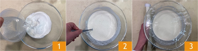 Pour préparer la morue en tempura avec brocolis, commencez par réaliser la pâte. Dans un bol, versez la farine, la farine 00 et l'eau gazeuse froide 1. Mélangez avec une fourchette 2 et ne vous inquiétez pas si le mélange n'est pas parfaitement lisse 3. Couvrez avec du film plastique et placez au réfrigérateur pendant environ 30 minutes, ou pendant que vous continuez avec les autres préparations.