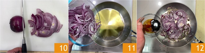 Préparez également les oignons caramélisés. Épluchez-les et coupez-les en tranches 10. Disposez-les dans une poêle avec de l'huile 11 et ajoutez le vinaigre balsamique 12.
