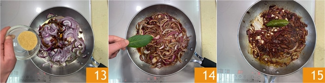 Ajoutez également le sucre de canne 13, une feuille de laurier 14 et faites cuire à feu doux pendant 15 minutes. Les oignons doivent être bien caramélisés 15.