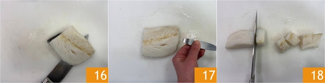 Retirez la peau de la morue 16, enlevez les arêtes avec une pince à épiler 17 et coupez-la en gros dés 18.