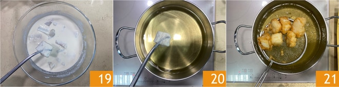 Trempez la morue dans la pâte, de manière à recouvrir uniformément les morceaux 19. Ensuite, plongez-les dans l'huile chaude 20, quelques morceaux à la fois pour ne pas faire baisser la température de l'huile 20. Égouttez-les une fois dorés 21.