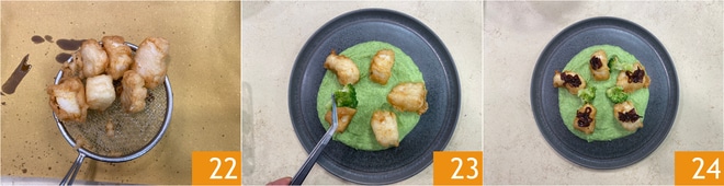 Transférez la morue frite sur un plateau avec du papier absorbant 22. Continuez la cuisson du reste puis dressez le plat : au fond, disposez la crème de brocolis chaude, les morceaux de morue et les fleurettes de brocolis 23. Placez sur le poisson également les oignons caramélisés et servez immédiatement votre morue en tempura avec brocolis 24 !