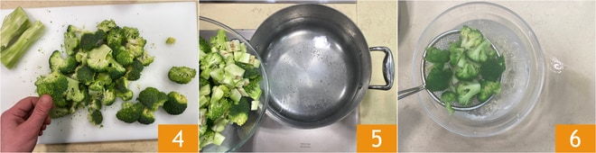 Nettoyez le brocoli et séparez les fleurettes 4 ; épluchez bien la tige et coupez-la en dés. Blanchissez le tout dans de l'eau salée pendant 4 minutes 5, puis égouttez et transférez dans de l'eau glacée 6.