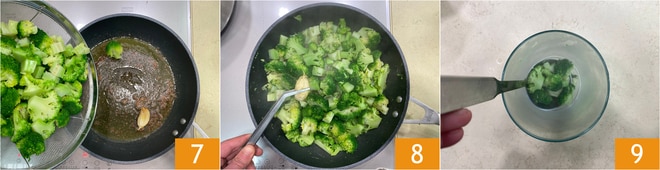 Entre-temps, préparez un soffrito avec de l'huile, de l'ail et les anchois. Une fois fondus, ajoutez les brocolis égouttés 7. Faites sauter pendant encore 5 minutes, puis retirez la gousse d'ail 8 et transférez les brocolis dans un contenant haut et étroit 9. Réservez quelques fleurettes pour la décoration des plats et mixez le reste, en ajoutant une louche de l'eau de cuisson jusqu'à obtenir une crème.