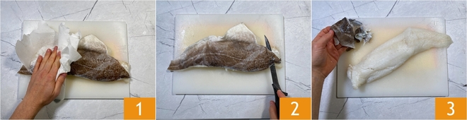 Pour préparer la morue frite à la romaine (en pâte), assurez-vous que la morue est bien dessalée, sinon suivez notre fiche "Comment dessaler la morue". Épongez la morue dessalée avec du papier absorbant 1, puis retirez la peau en vous aidant d'un couteau 2 3.