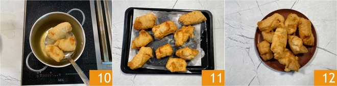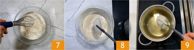 Mélangez avec le fouet 7 jusqu'à obtenir une pâte dense et couvrante. Chauffez l'huile de graines dans une grande casserole à double fond ; lorsqu'elle atteint une température de 190°, il est temps de frire. Plongez 2-3 morceaux de morue dans la pâte 8 puis plongez-les immédiatement dans l'huile 9.