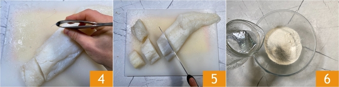 Retirez également les arêtes à l'aide d'une pince 4. Coupez ensuite la morue en 8 morceaux d'environ la même taille 5 et mettez-les de côté un instant. Dans un bol, versez la farine et l'eau pétillante en filet 6.