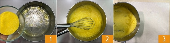 Pour réaliser la morue frite avec crème d'avocat, commencez par préparer la polenta pour faire les chips : dans une petite casserole, portez à ébullition l'eau à laquelle vous aurez ajouté un filet d'huile et une pincée de sel, puis versez progressivement la farine de maïs tout en remuant avec un fouet 1. Baissez légèrement le feu et laissez épaissir le mélange en continuant à remuer avec le fouet 2. Une fois la consistance désirée atteinte, versez la polenta au centre d'une feuille de papier sulfurisé 3.
