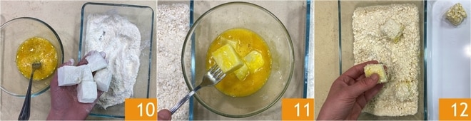 Passez les morceaux d'abord dans la farine, en veillant à enlever l'excédent 10, puis dans l'œuf 11 et enfin dans le panko 12.