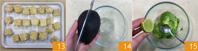 Au fur et à mesure que vous panez la morue, déposez les morceaux sur un plateau 13. Placez le plateau au réfrigérateur et préparez la crème d'avocat : coupez l'avocat en deux 14, retirez la chair et mettez-la dans un bol, puis ajoutez le jus de citron vert 15.