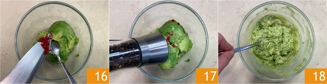 Ajoutez aussi le piment haché, sans les graines 16, du sel et du poivre 17. Écrasez le tout à la fourchette pour en faire une crème 18. Placez également la crème d'avocat au réfrigérateur, couverte d'un film.