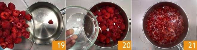 Enfin, préparez la sauce aux framboises : mettez les framboises dans une petite casserole 19, ajoutez un filet d'eau 20 et faites cuire environ 5 minutes à feu moyen 21.
