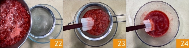 Lorsque les framboises sont ramollies, versez-les dans un tamis posé sur un bol 22 et pressez avec une spatule pour les tamiser et éliminer les petites graines 23 24.