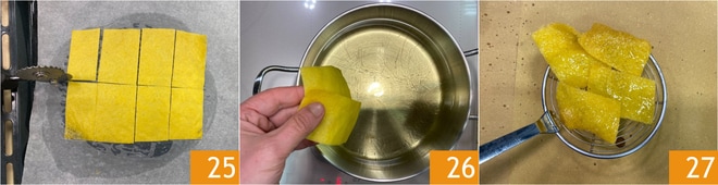 Vous êtes prêts à frire : reprenez la polenta et coupez-la en rectangles 25. Chauffez l'huile végétale jusqu'à 180°C et faites frire quelques morceaux à la fois jusqu'à ce qu'ils soient dorés 26, puis égouttez sur du papier absorbant 27.