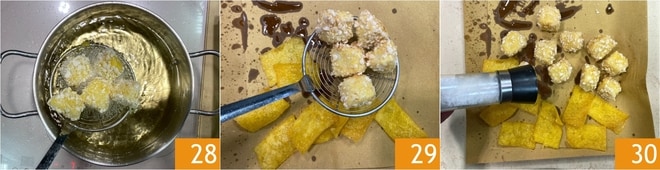 Dans la même huile, faites également frire les morceaux de morue 28 et, une fois dorés, égouttez-les toujours sur le papier absorbant 29. Salez à votre convenance 30.