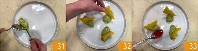 Vous pouvez maintenant dresser : à l'aide de 2 cuillères à café, formez des quenelles de crème d'avocat 31, puis ajoutez les chips de polenta 32 et quelques gouttes de sauce aux framboises 33.