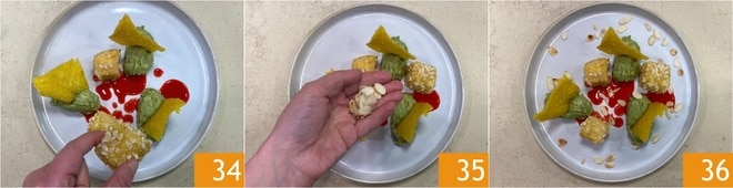 Complétez avec des amandes effilées grillées 34 et quelques feuilles de thym et de marjolaine. Si vous le souhaitez, vous pouvez garnir avec des fleurs comestibles au choix 35. Votre morue frite avec crème d'avocat est prête à être servie 36 !