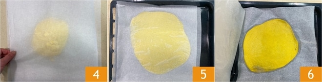 Couvrez avec une autre feuille de papier sulfurisé 4 et étalez la polenta avec un rouleau à pâtisserie pour la rendre très fine. Transférez le tout sur une plaque de cuisson 5 et faites cuire au four ventilé préchauffé à 180°C pendant environ 30 minutes. Passé ce temps, sortez du four et laissez refroidir 6.