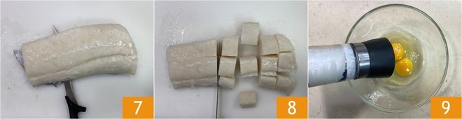 Pendant que la polenta est au four, vous pouvez vous occuper de la morue : elle sera déjà dessalée, mais rincez-la encore sous l'eau courante puis épongez-la pour la sécher. Retirez la peau avec un couteau bien aiguisé, en essayant de ne pas enlever trop de chair 7. Coupez la chair en morceaux de 3 à 4 cm environ 8. Dans un bol, assaisonnez les œufs avec du sel et du poivre 9, puis battez-les avec une fourchette. Versez la farine et le panko dans deux autres bols et procédez à la panure.
