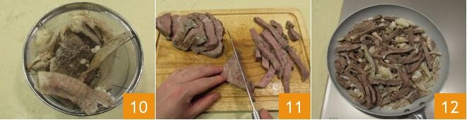 Une fois la cuisson terminée, prélevez les abats, égouttez-les bien 10 et coupez-les en lanières 11. Faites revenir tous les abats dans une poêle pour les faire sécher 12.