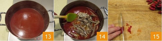Lorsque la sauce tomate est bien réduite 13, ajoutez la tripe et le reste des abats 14. Poursuivez la cuisson pendant 1 heure et demie. Hachez le piment avec un couteau 15.