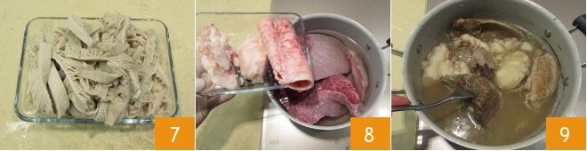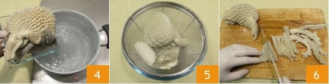 Entre-temps, consacrez-vous au nettoyage des abats : rincez-les soigneusement sous l'eau courante, sinon vous pouvez demander à votre boucher de confiance des morceaux d'abats déjà nettoyés. Faites bouillir la tripe pendant 25 minutes 4, ou jusqu'à ce que les viandes soient tendres, puis égouttez 5 et coupez en lanières 6.