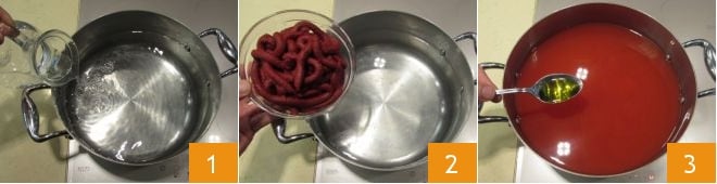 Pour réaliser le Morzello, versez l'eau dans une grande casserole 1 et délayez-y le concentré de tomate 2, salez, ajoutez l'huile d'olive 3 et laissez réduire la sauce pendant environ 3 heures à feu moyen, ou jusqu'à ce qu'elle soit bien épaissie. Cette cuisson permettra d'obtenir une sauce au goût intense pour mieux assaisonner les abats.